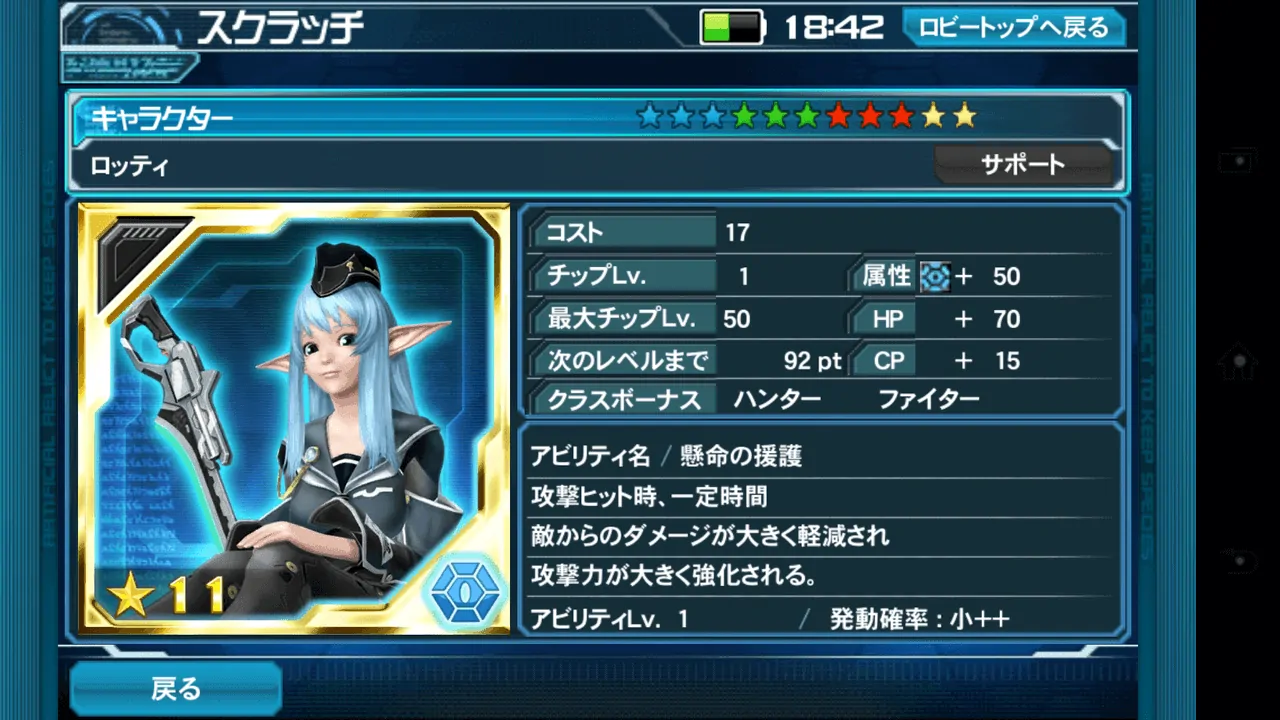 攻撃力UPとダメージ軽減みたいですね。正直、esメインのリューネだと入るスキがないのですが、今回出したのはなんとロッティちゃん!