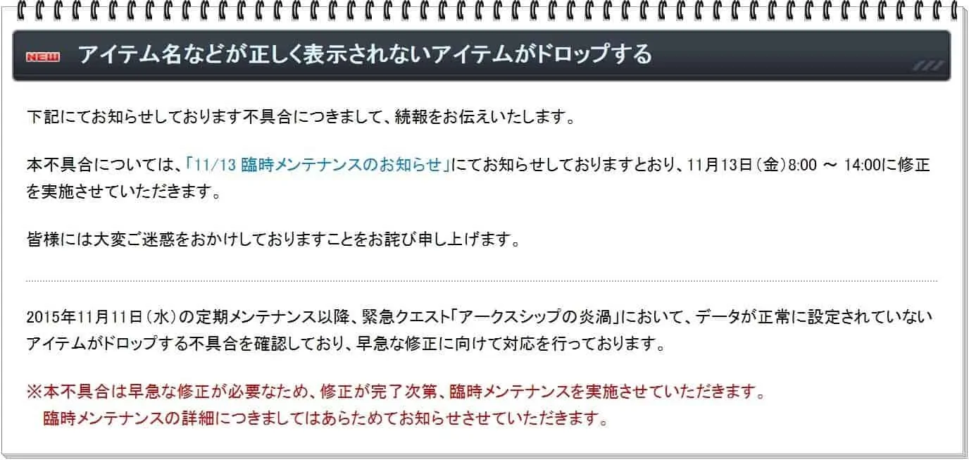 11/13に臨時メンテで解消されるようです。目途がたったあとにメンテしまーすと告知があったので多少後ろにずれるかもですがなんとかなりそう。