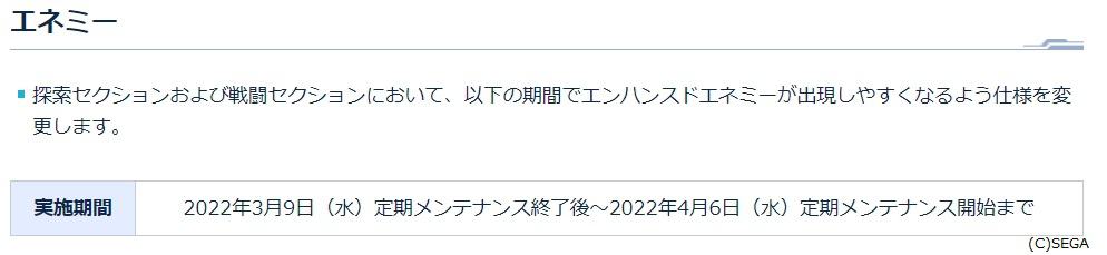 エンハンスドエネミーはエンハンサーがついてて破壊するとエネミーが弱体化して本体に攻撃が有効になる仕様。期間=スプリング’22のシーズンイベントと同じです。つまりシーズナルポイント稼ぎに影響がでる。