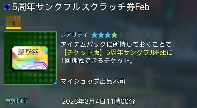 | 内容 | 第16回。いつもの内容。STEP1を40回最後まで引くと、5周年サンクフルスクラッチ券Feb×1 |