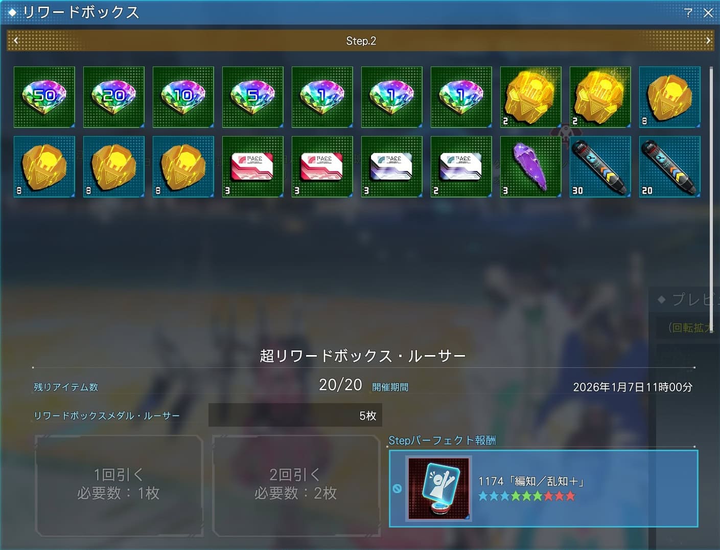 リワードボックスとしての第15弾(無料)今回から改善されてアイテム追加+stepパーフェクト報酬が追加。新アイテムのニフテリーダスV2[Ba]、1174「編知/乱知+」あり