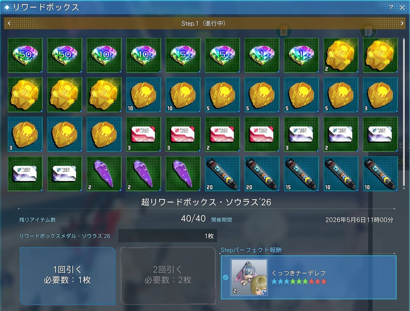 PSO2:NGSの期間限定「超リワードボックス・ソウラス’26」の一覧