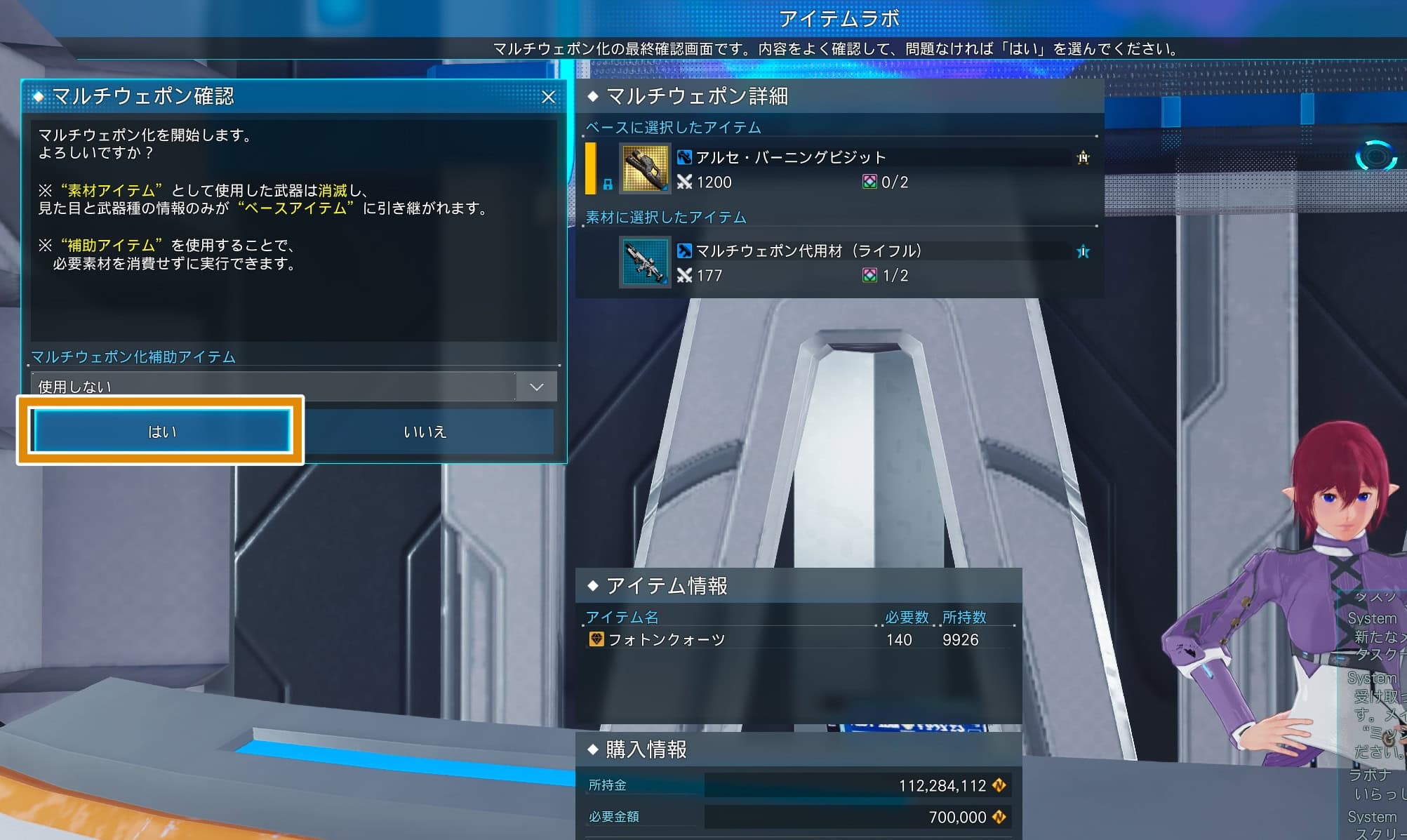 • 次に素材アイテム(マルチウェポン代用材)を選ぶ