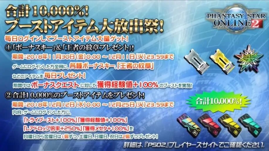 期間は11月20日23:00~11月28日メンテまで。忘れずに!#PSO2 pic.twitter.com/mloo9jaxSK— ロボアークス@PSO2NGS攻略まとめ (@Ryune_zoldark) November 20, 2018